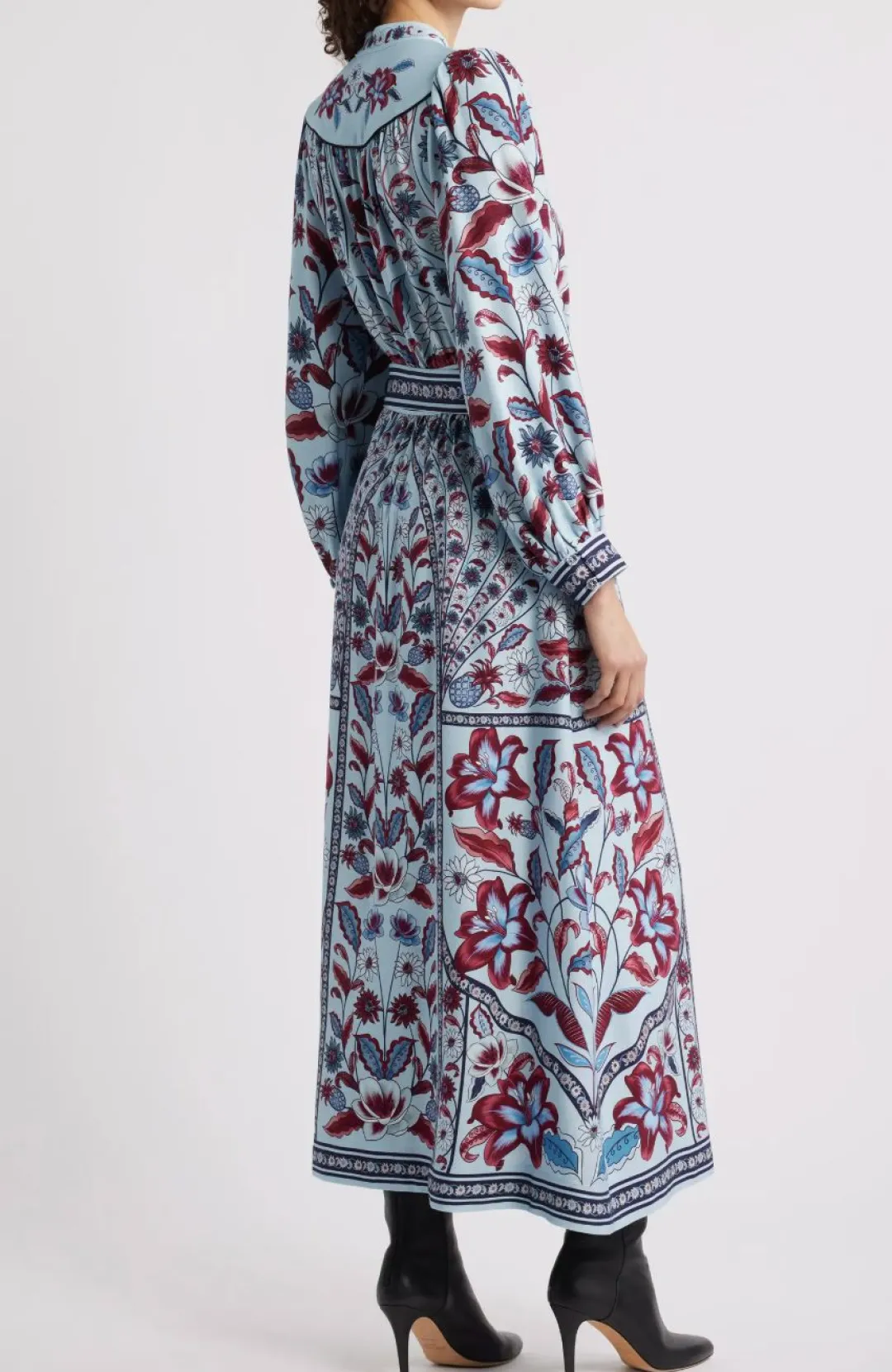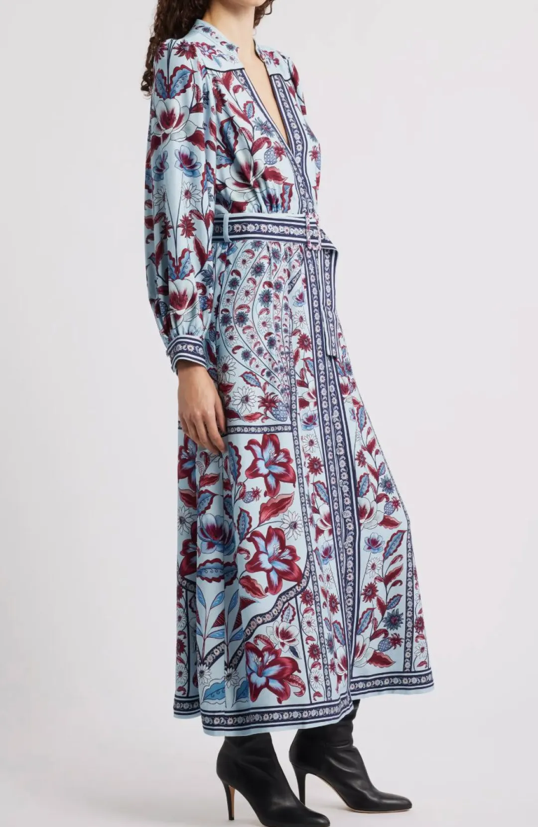 A flower-print banded border traces the edges and details the belt of this lovely, silky dress styled with a deep split neckline and framed by bloused sleeves.