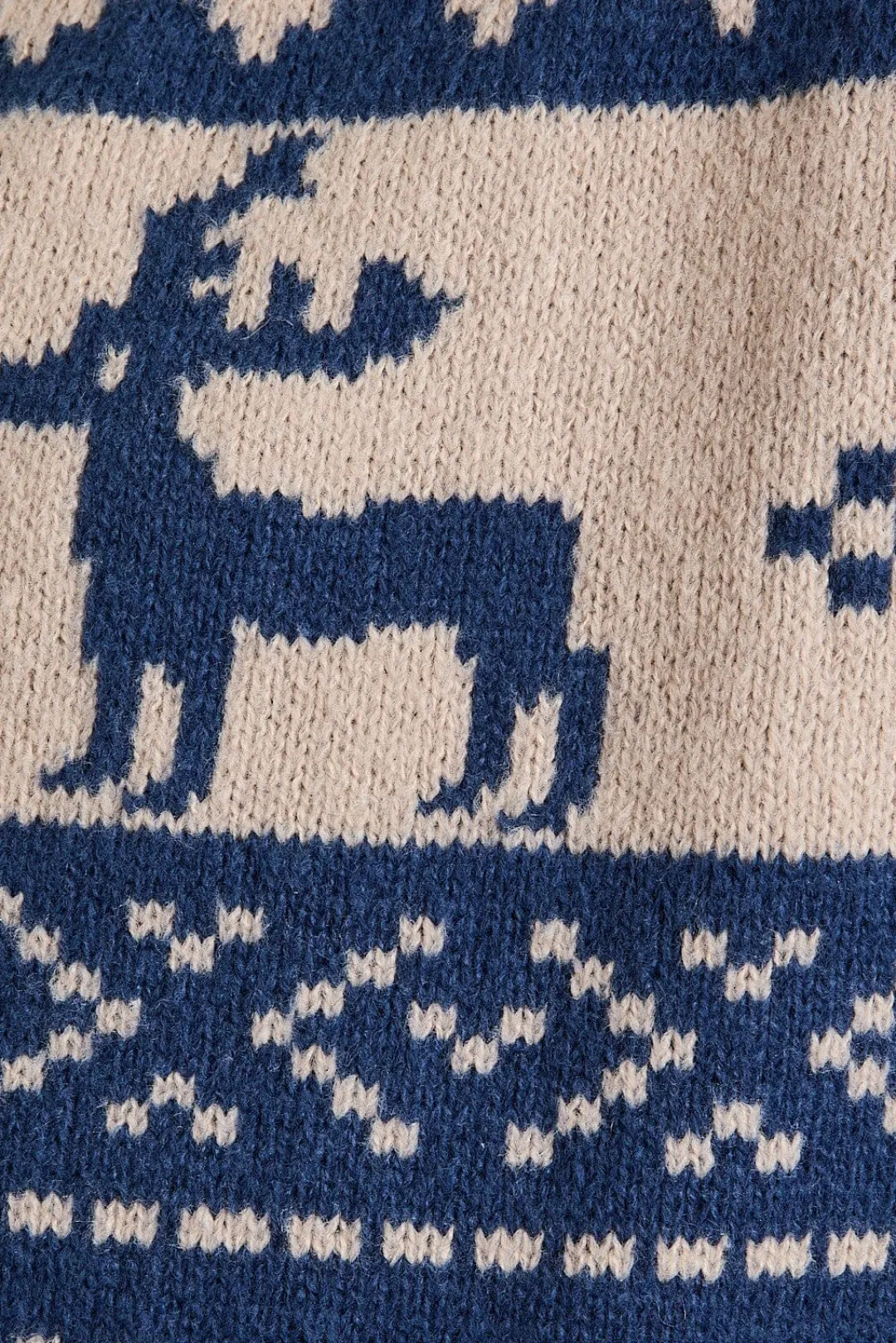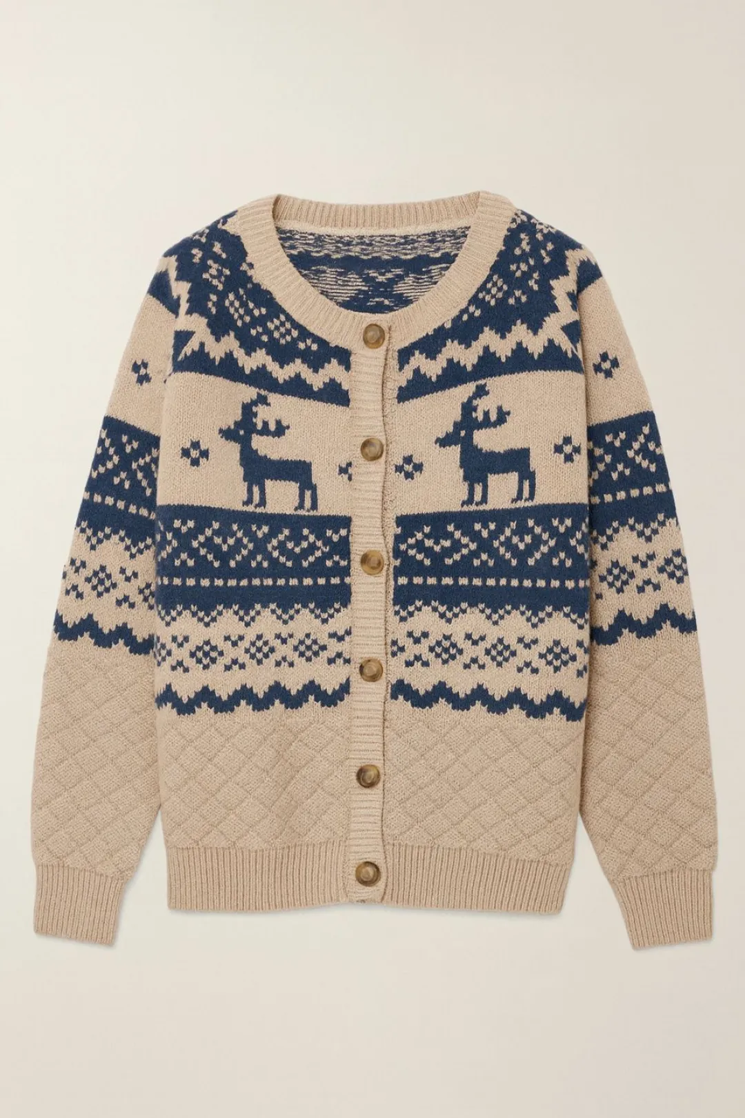 Wrap yourself in cozy winter charm with this delightful Fair Isle cardigan, featuring adorable reindeer prancing across a rich navy and warm taupe palette. Perfect for holiday gatherings or casual winter days, this quilted beauty combines festive flair with timeless comfort. The classic Fair Isle pattern brings playful personality to your seasonal wardrobe, while the soft, insulating construction keeps you snug when temperatures drop. A true winter favorite that celebrates the season in style.