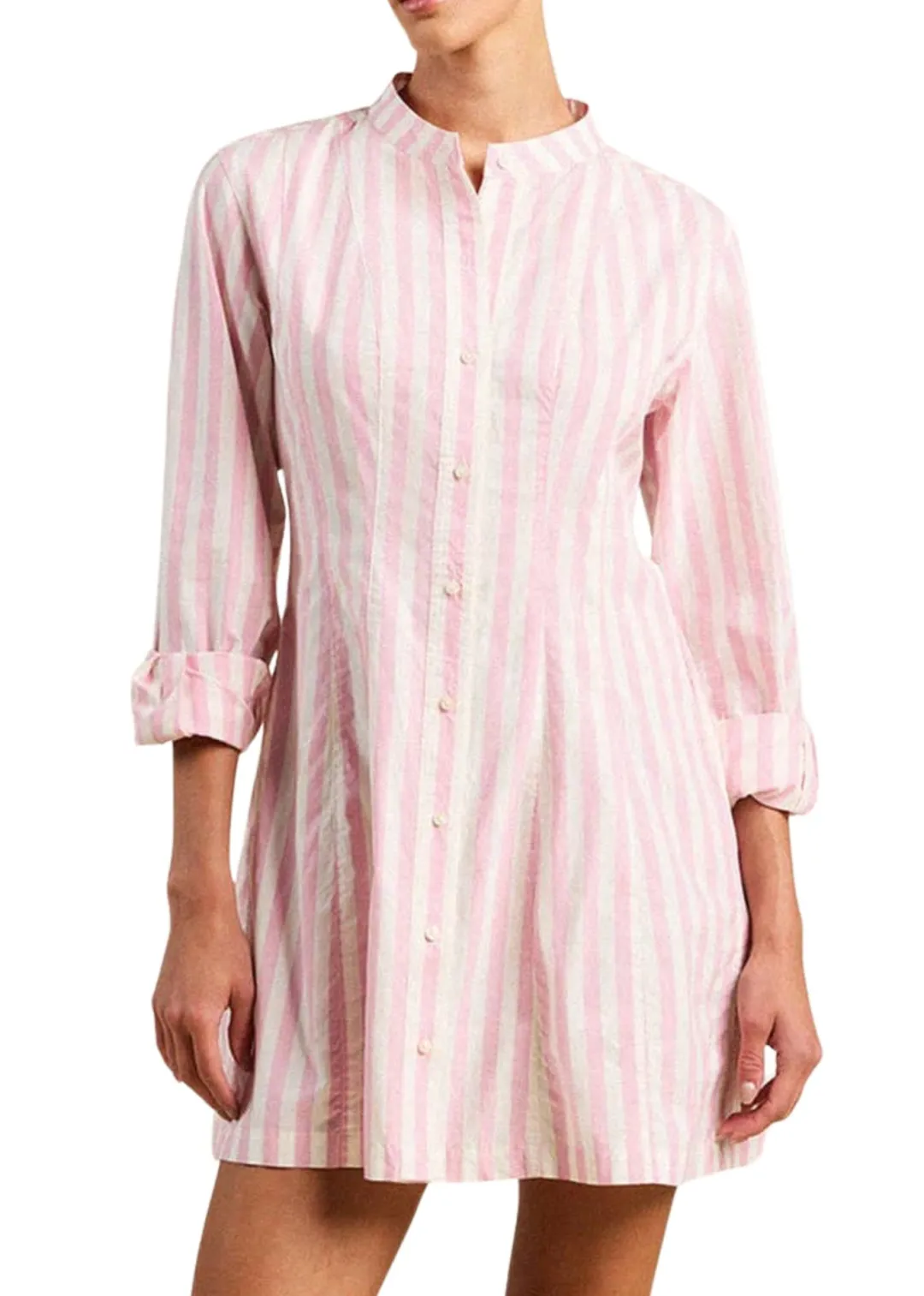 The Marina Dress is our short, streamlined shirt dress with vertical seams that define the waist and flare at the bottom hem. Finished with a full button-front placket, clean collar, bracelet-length sleeves, and our signature hidden side pockets. Shown here in Pink Stripe and made from our cotton poplin.