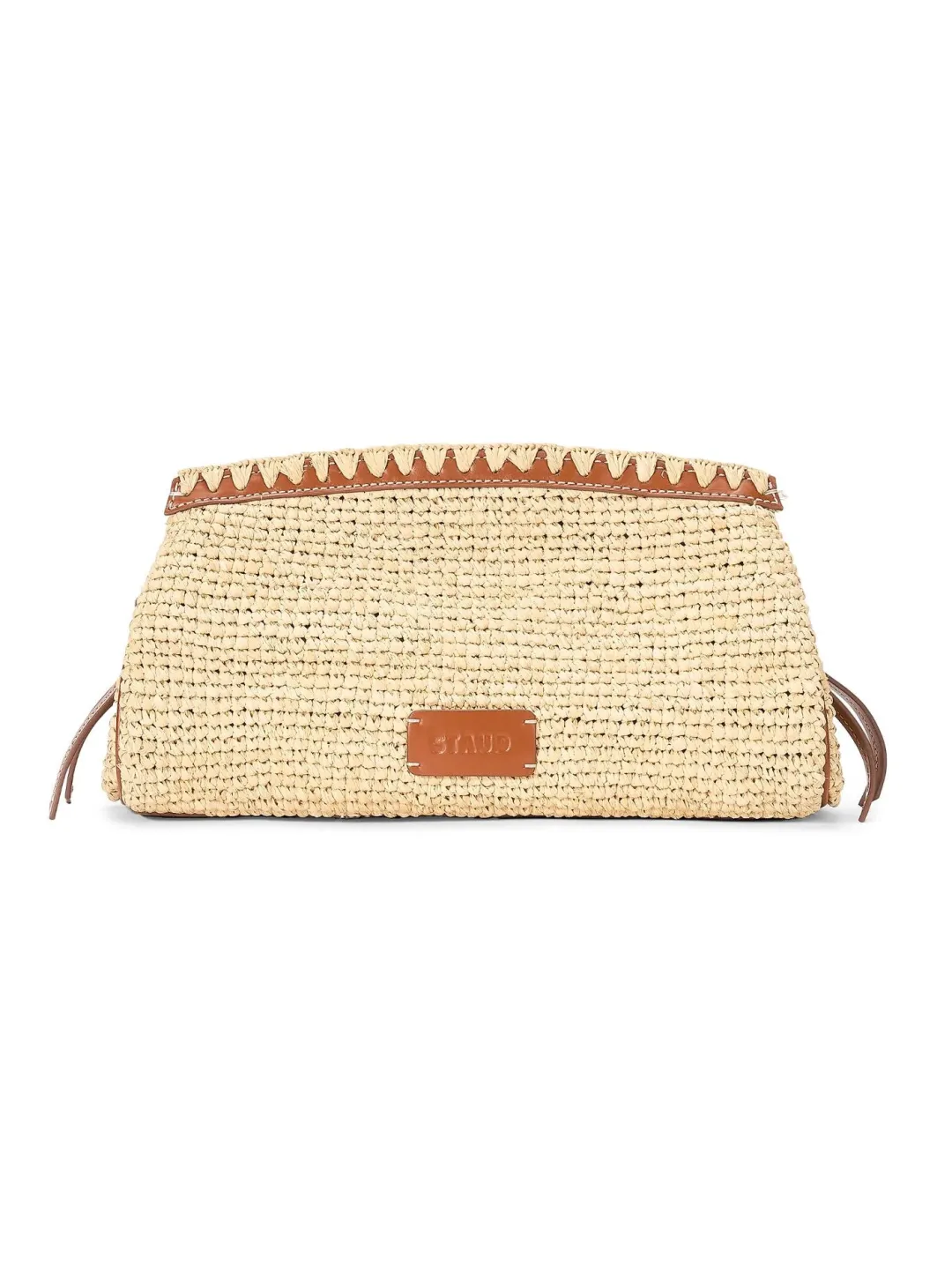This Maude clutch is crafted of raffia with leather trim and side ties.