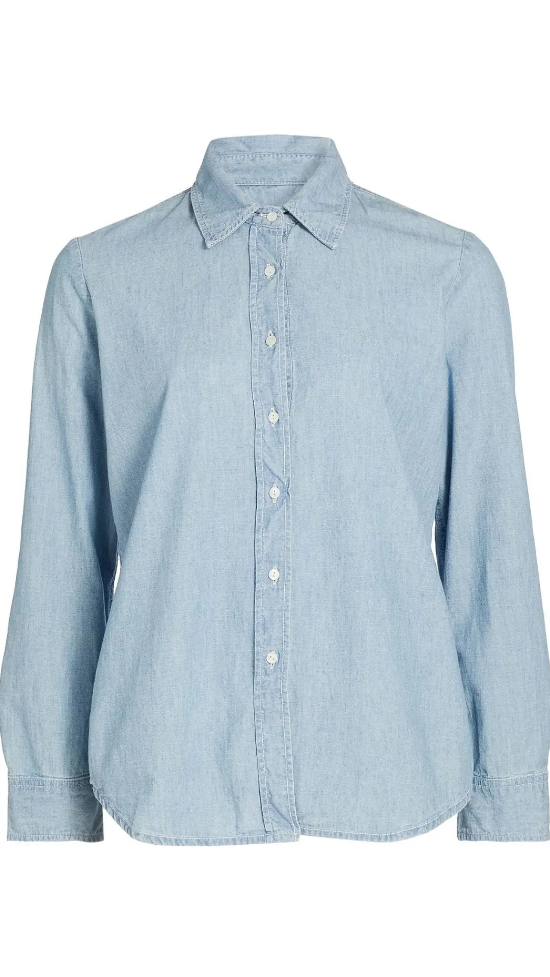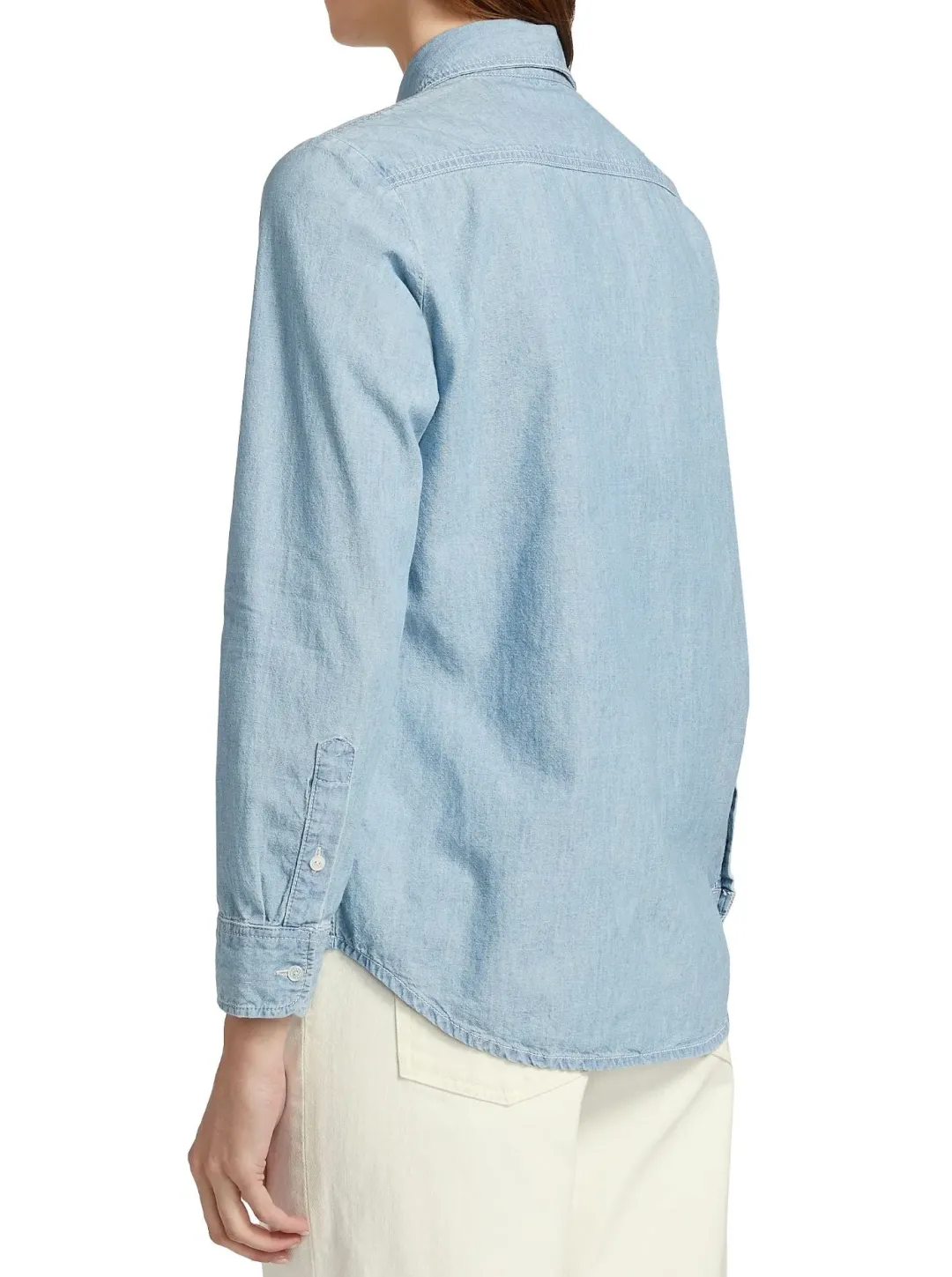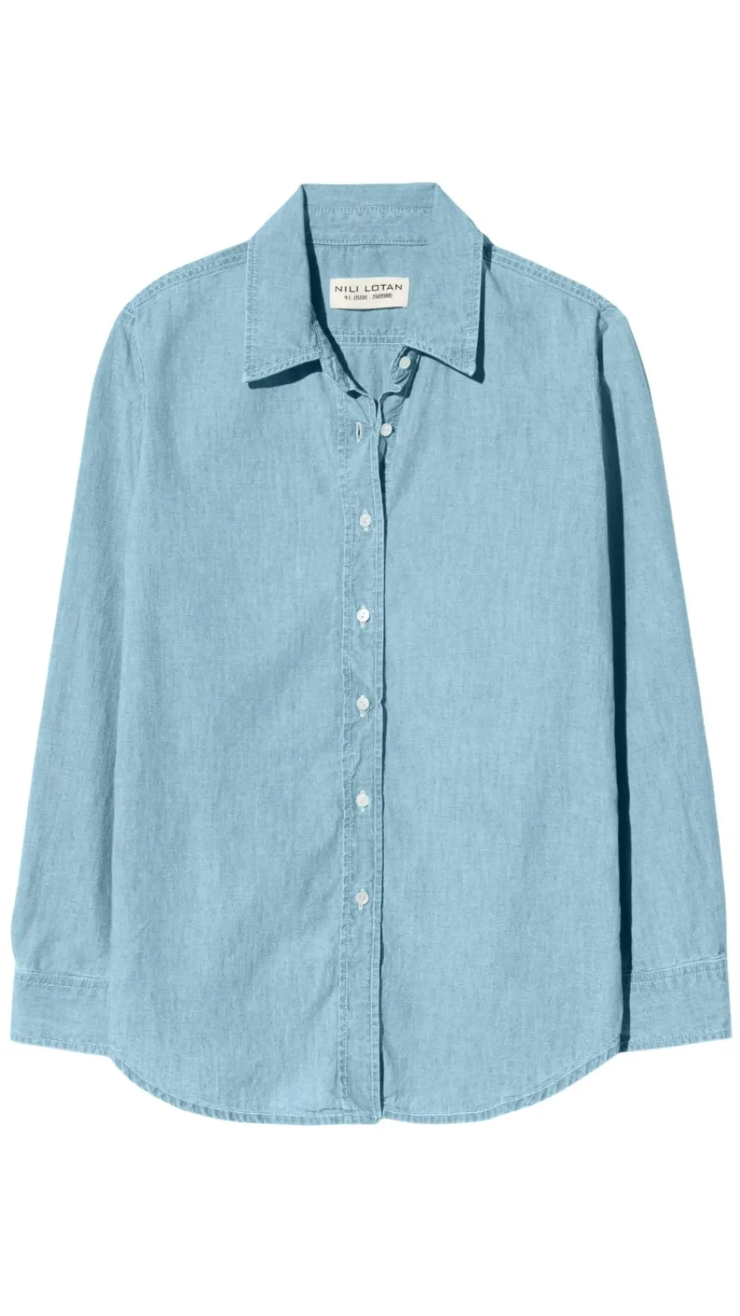 This denim shirt from Nili Lotan is crafted of cotton, featuring a classic spread collar and shirttail hem.