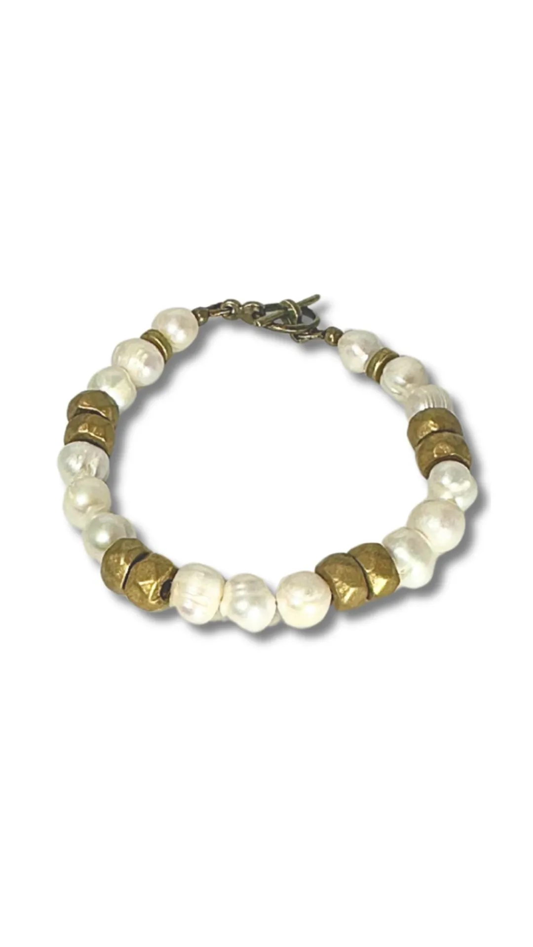 NEW! Freshwater pearls with faceted Indian brass rondelles bring together a subtle look with a statement.