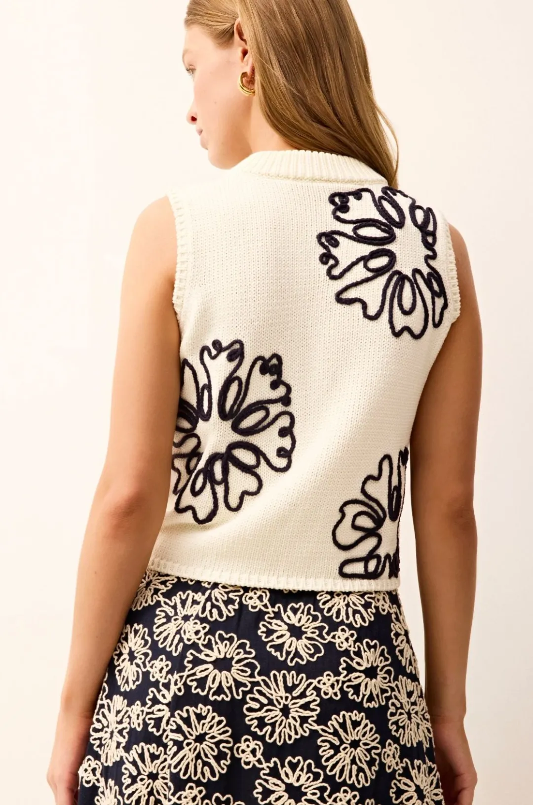The Natasha top delivers an easy cropped fit with a classic crewneck, elevated by oversized floral embroidery in navy blue on a crisp white ground. Paired here with the matching Sasha skirt in Blossom, it’s a polished, packable choice for spring getaways.