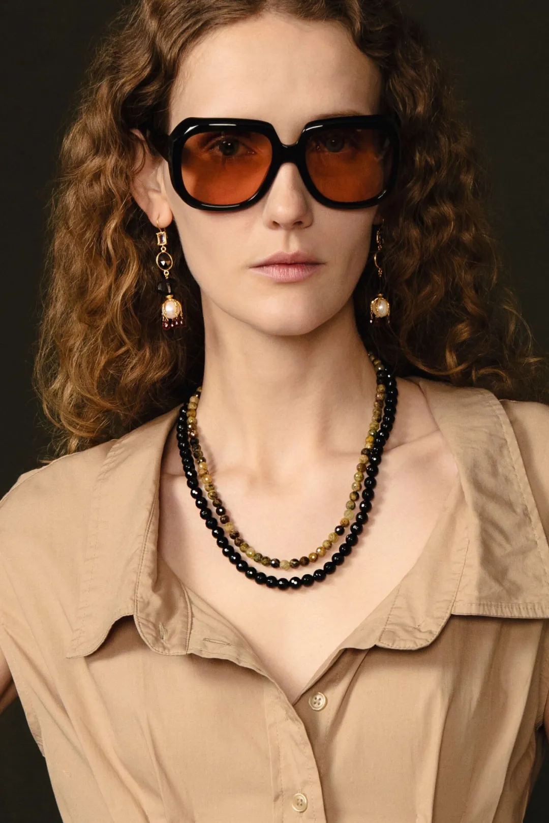 18K gold plated sterling silver necklace featuring onyx and green garnet. 20in. length.
