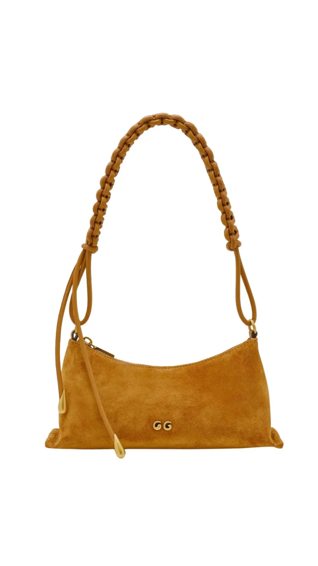 A suede leather shoulder bag with gold-toned hardware and an intricately woven strap.