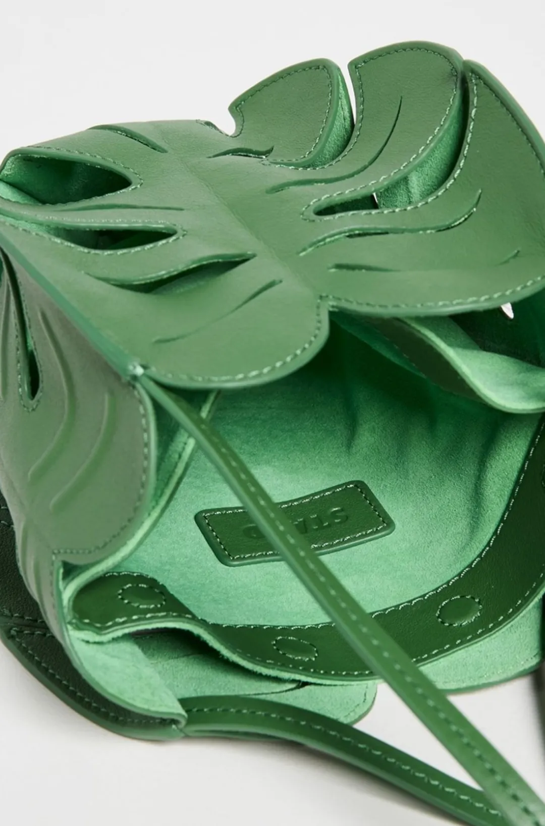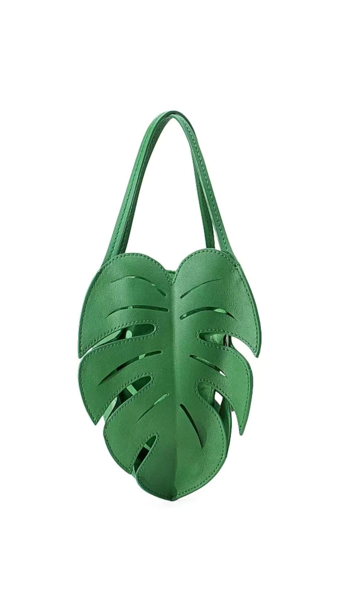 The aptly titled tote has a North/South silhouette made from bright green leather covered with three-dimensional palm leaves. It adds a playful touch to summer looks.