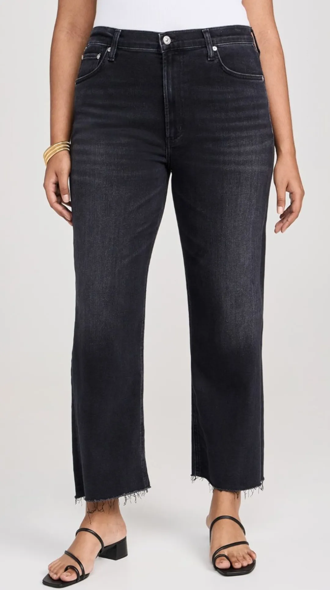 A dark wash with minimal fading ensures a polished, casual-chic appearance in these slim-cut, raw-cropped jeans.