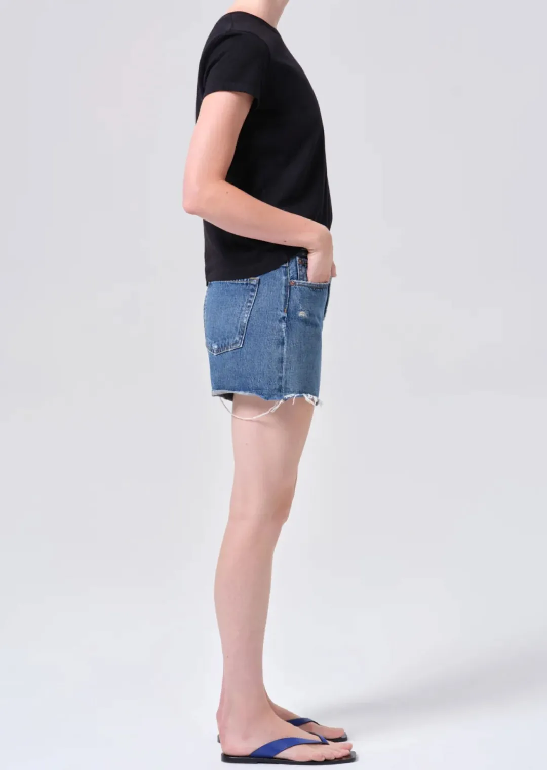 Looks Like: Medium stone washed indigo denim short