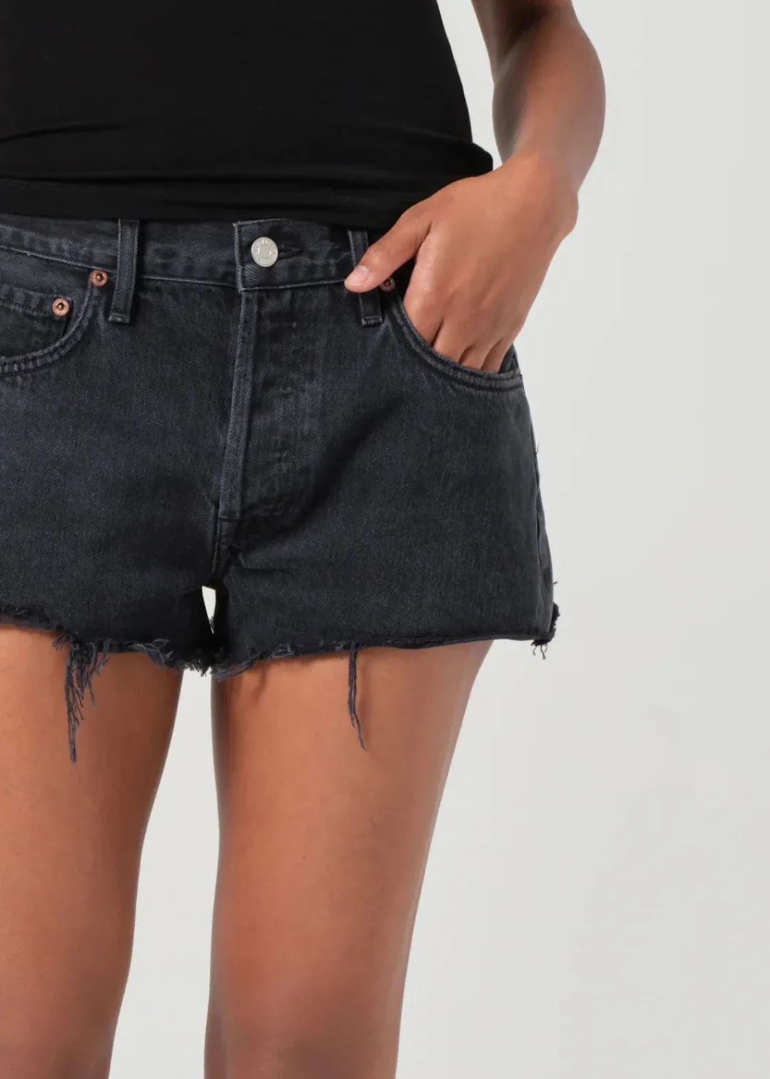 A relaxed fit and destroyed black-wash denim create plenty of vintage attitude on high-rise shorts finished with ragged raw-edge hems.