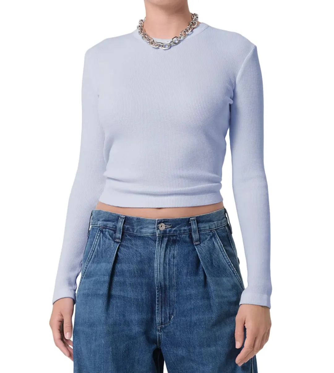 An appealing, trim-fitting waffle knit keeps you cozy in this long sleeve T-shirt made from recycled cotton.