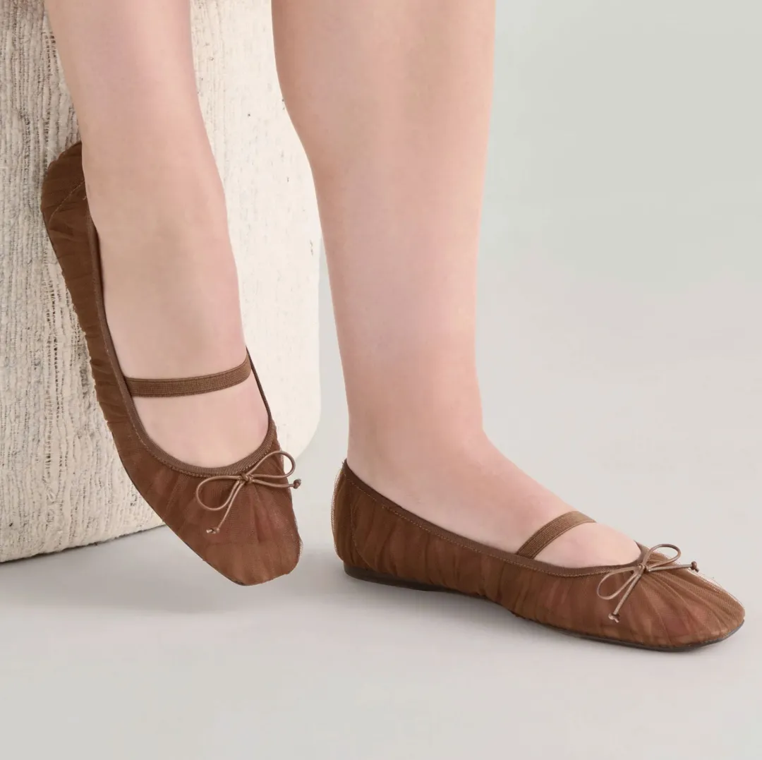 A gauzy overlay and mary jane strap add everyday charm to this square-toe ballet flat.