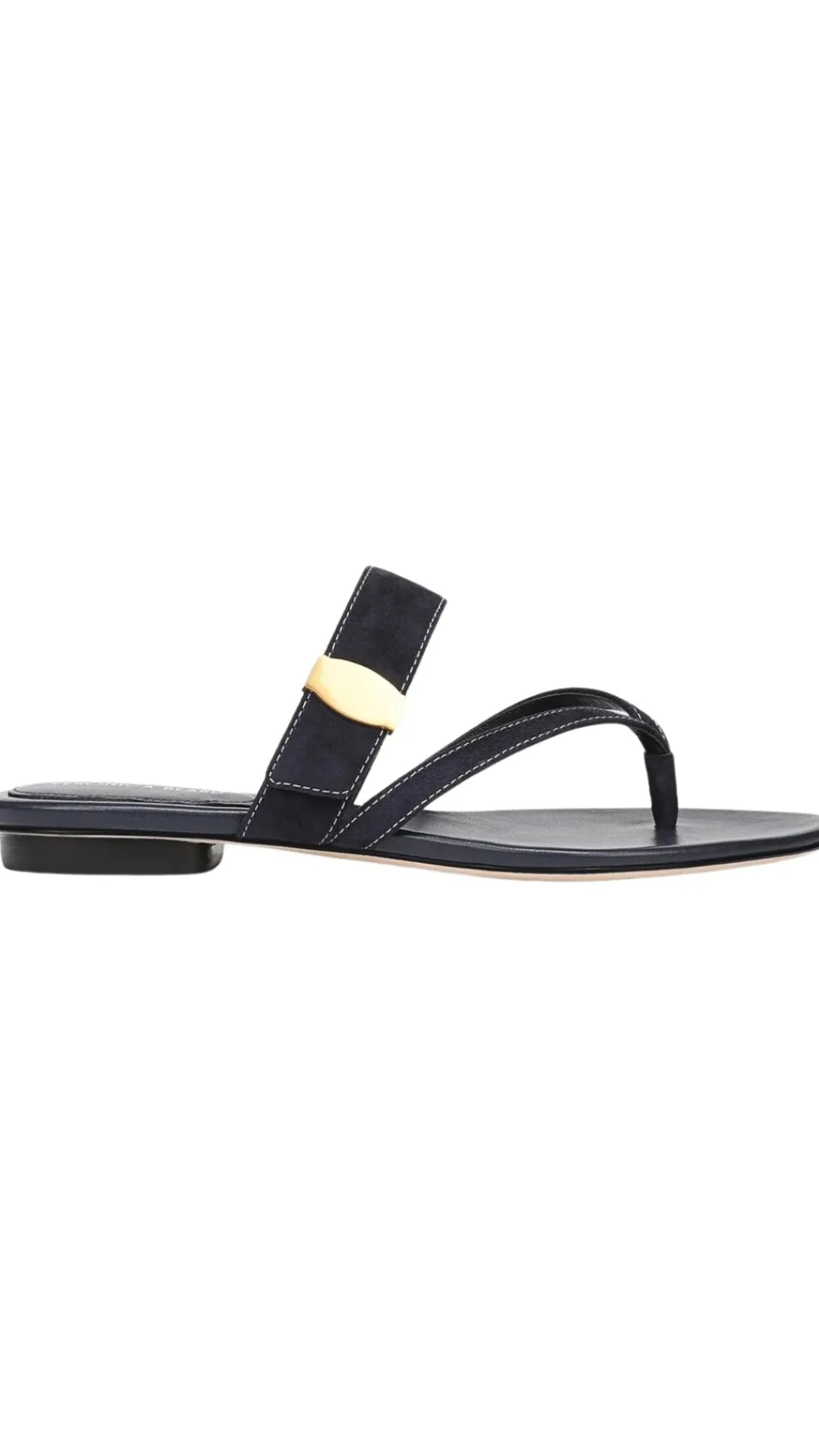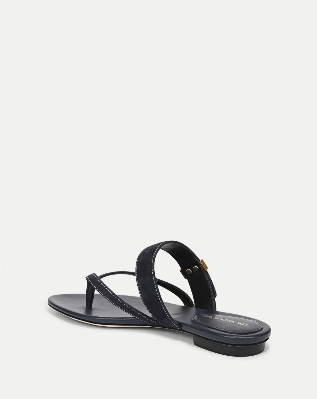 A modern take on the classic flip-flop, the Salva in navy blue suede features a thong toe and a wide upper strap, accented with our signature collar stud buckle in gold for a polished, understated finish. Finished with contrast topstitching and a cushioned footbed, it’s perfect for weekends and warm-weather getaways.