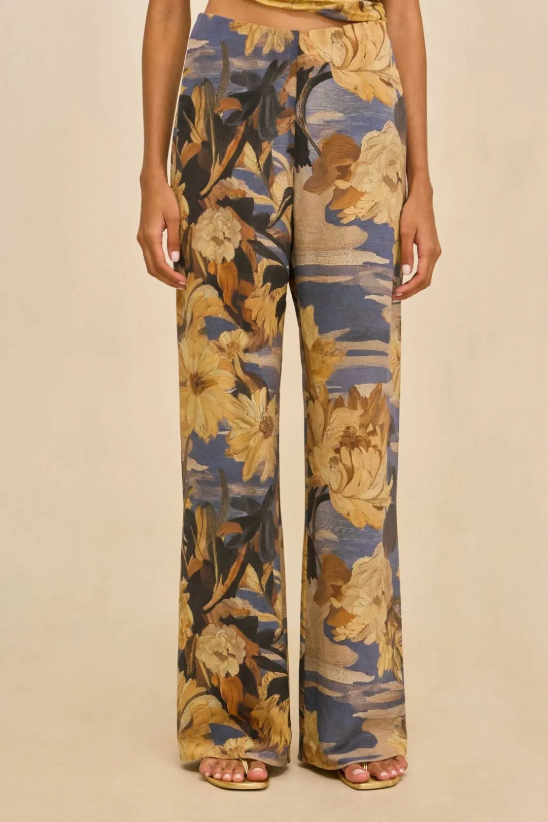 A high-waisted wide-leg pant in patterned floral silk designed for an elongated, effortless drape.
