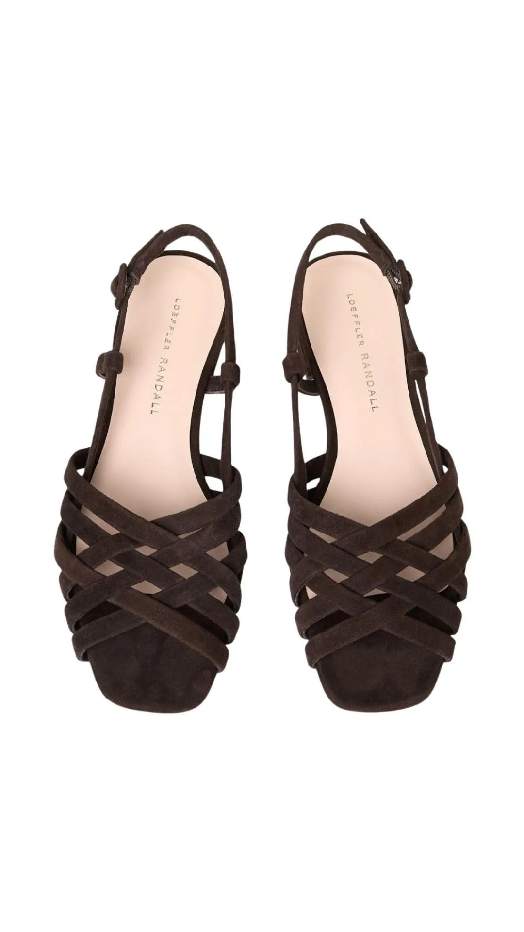 Mid-heel sandal in dark brown suede. Features a latticed strap design, an adjustable sling-back strap with a buckle closure, and a padded footbed with a gold-stamped logo.