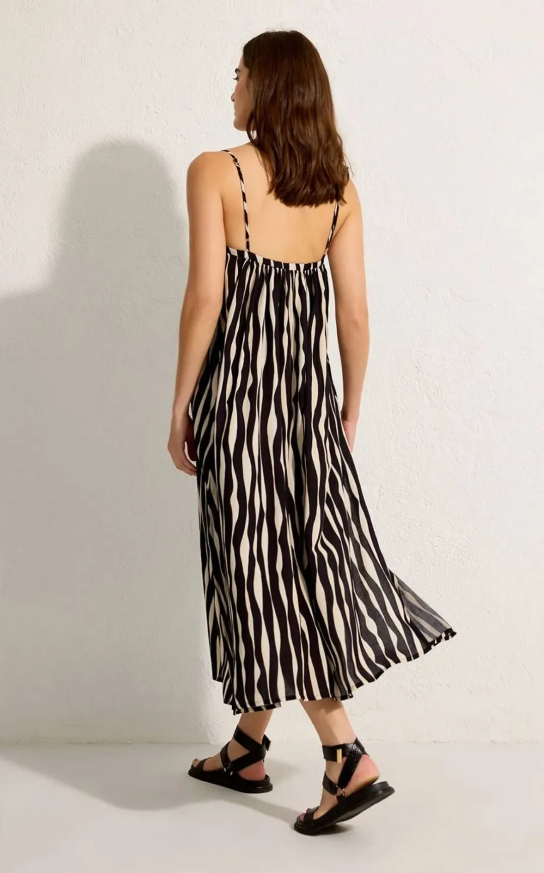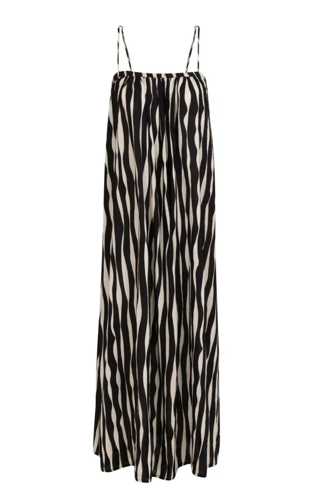 Straight neckline with thin, adjustable straps, and side slits that enhance the lightness of the piece;