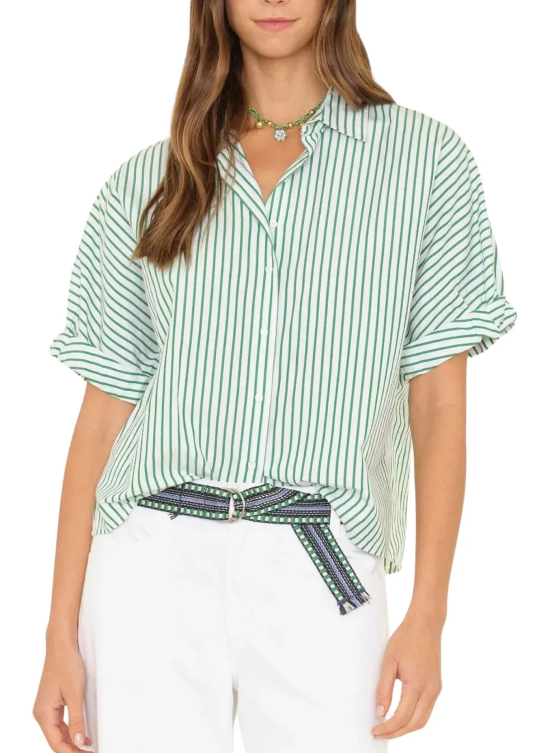 Striped Delight. Teddy is updated this season in our crisp multicolor stripe cotton. Teddy is an easy, cropped button-front shirt with a boxy fit, rolled sleeves, and back yoke.