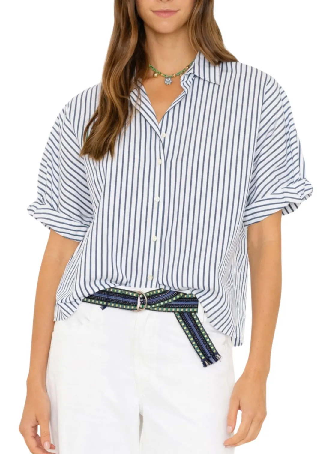 Striped Delight. Teddy is updated this season in our crisp multicolor stripe cotton. Teddy is an easy, cropped button-front shirt with a boxy fit, rolled sleeves, and back yoke.