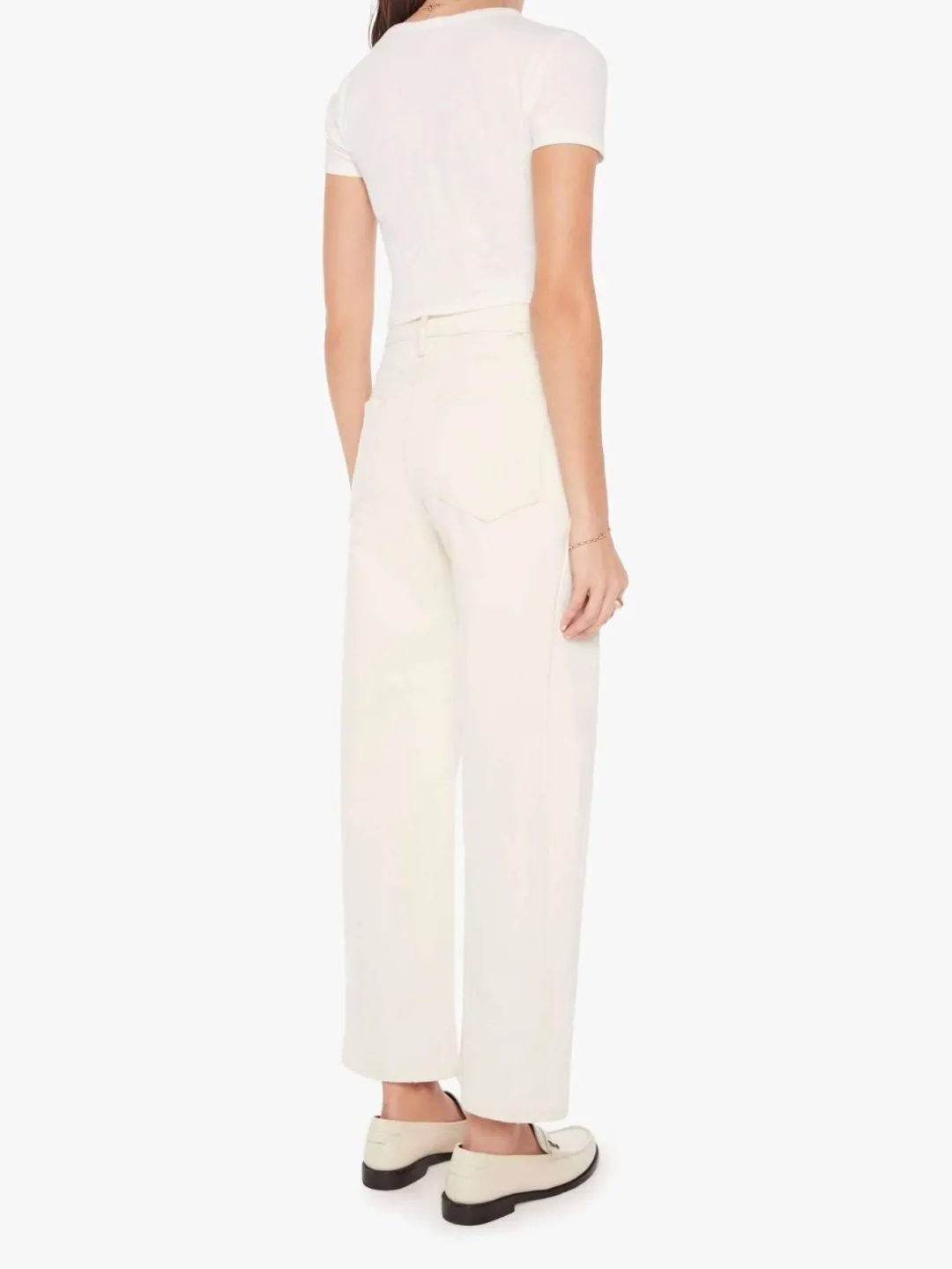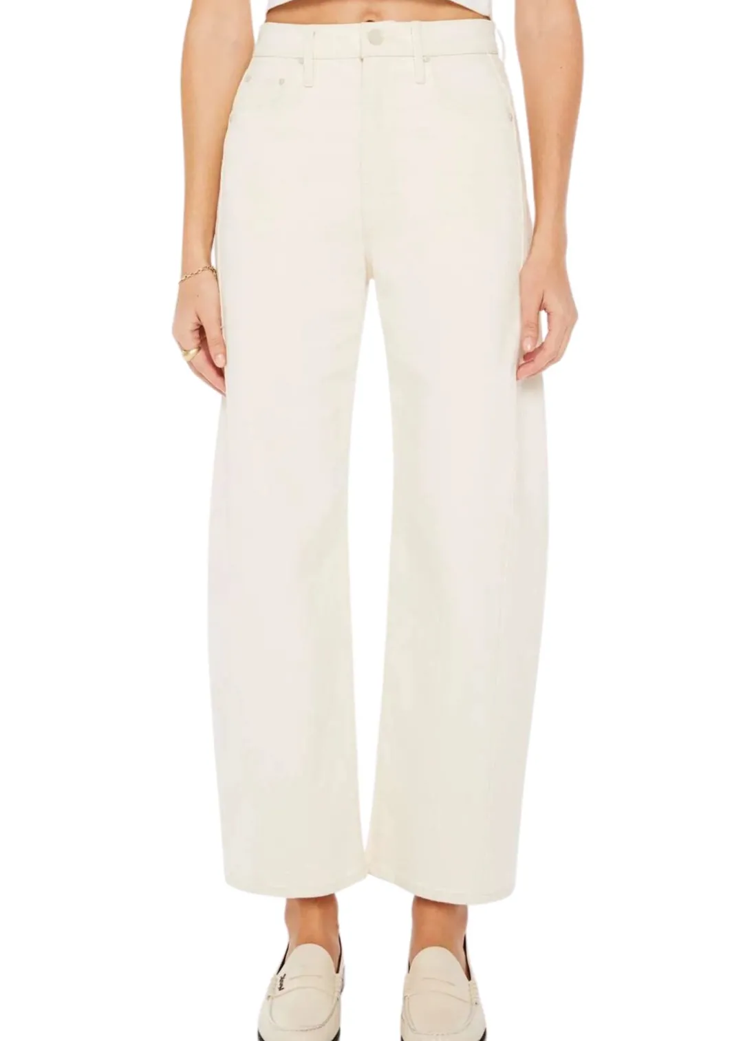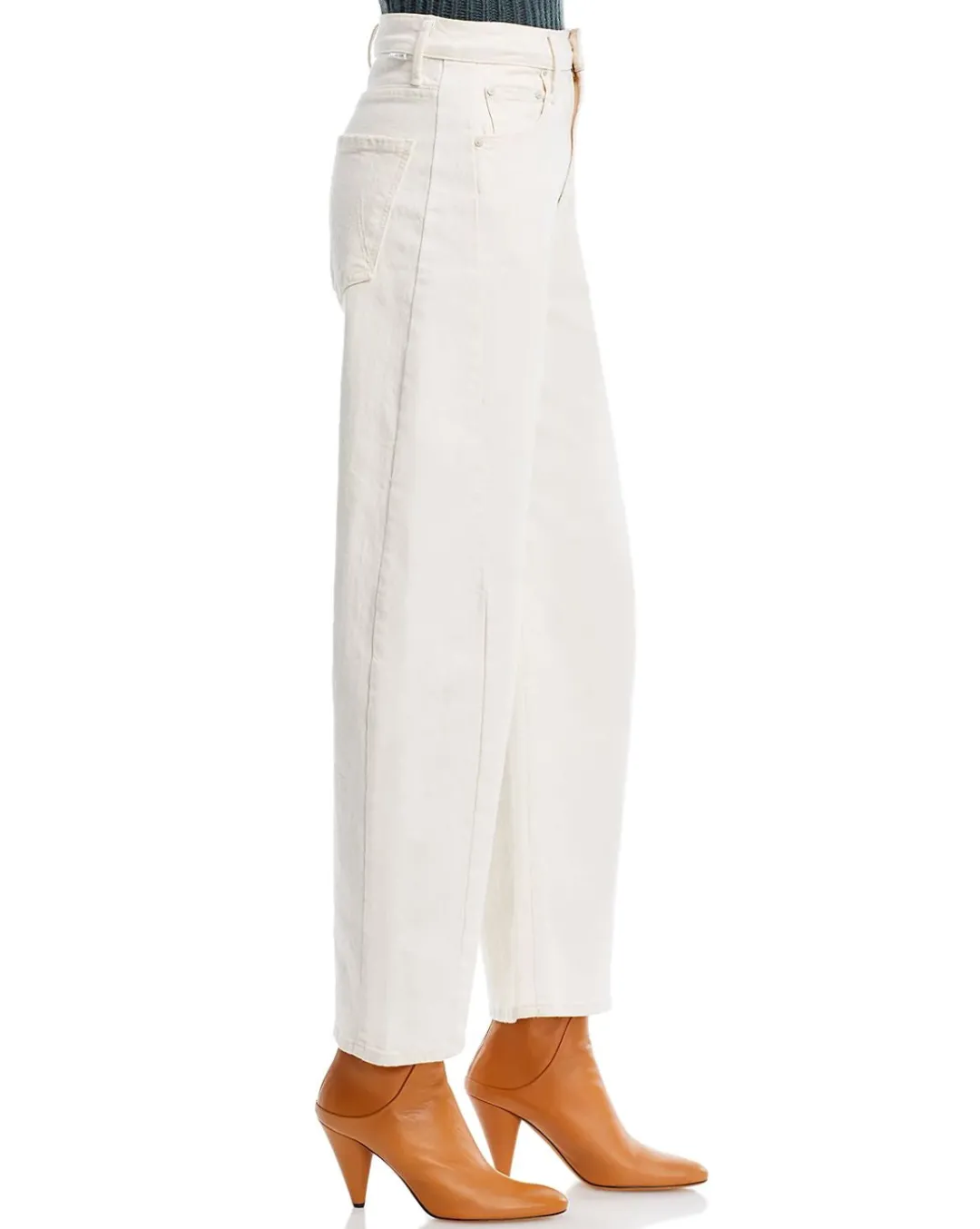 Au naturel. A super high-waisted jean with a wide, curved leg, a 29″ inseam, and a clean hem. Cut from a SUPERIOR cotton blend with a touch of stretch, Act Natural is a creamy white hue with tonal hardware.