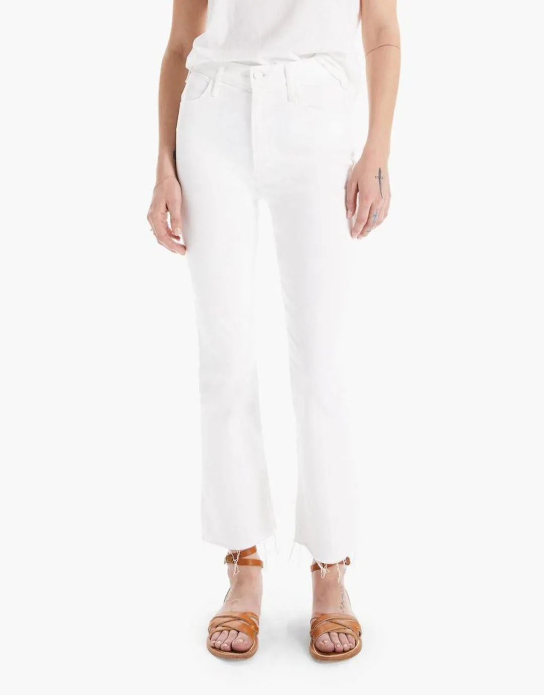 Mirror, mirror. MOTHER likes what she sees when she wears her high waisted flare jeans in a brand new white denim. Ankle length and frayed hem.