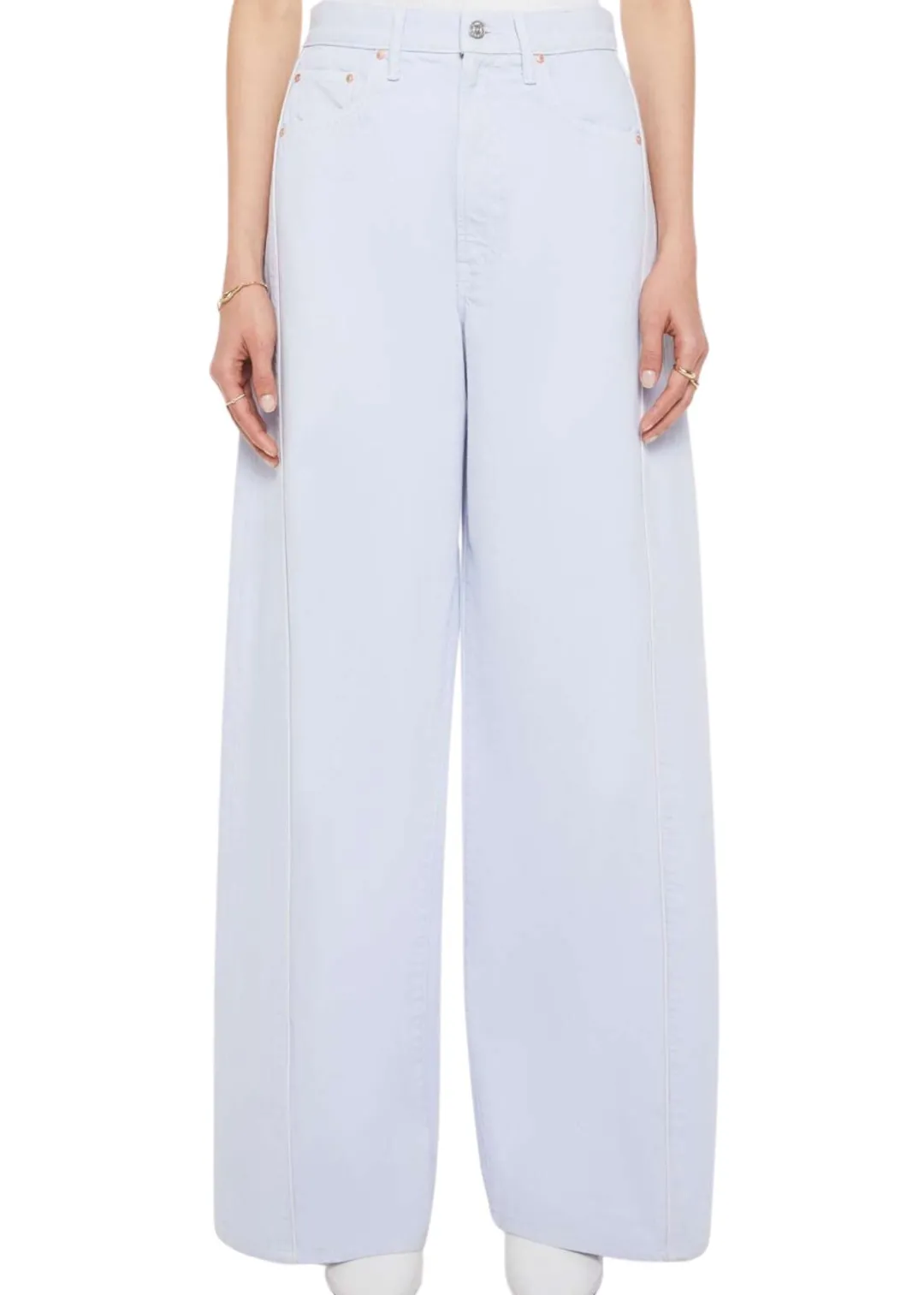 “Piped-Dream” high-rise wide-leg jeans with panel and contrast piping details in a soft light periwinkle blue wash.