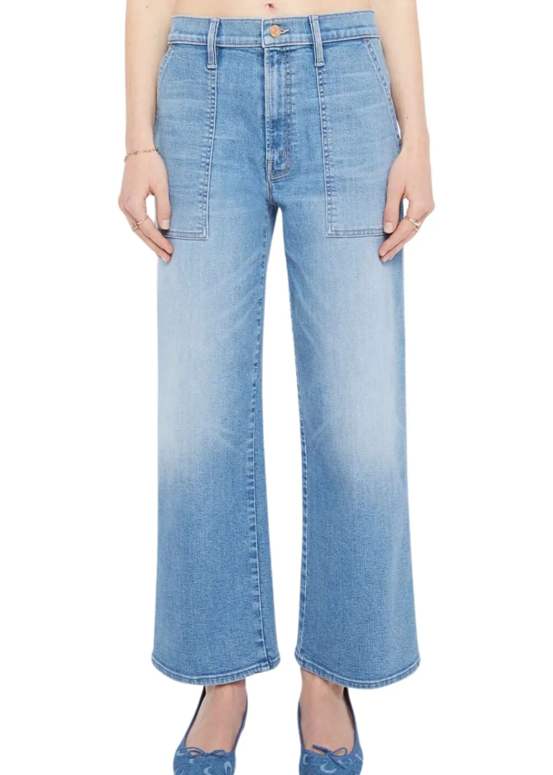 Full throttle. Super high-waisted jeans with a loose fit, wide leg, zip fly, patch pockets and a 28.25-inch inseam with a clean hem. Made from a blend of recycled stretch denim, Ride Hard Live Louder is a light blue with subtle whiskering and fading at the knees.