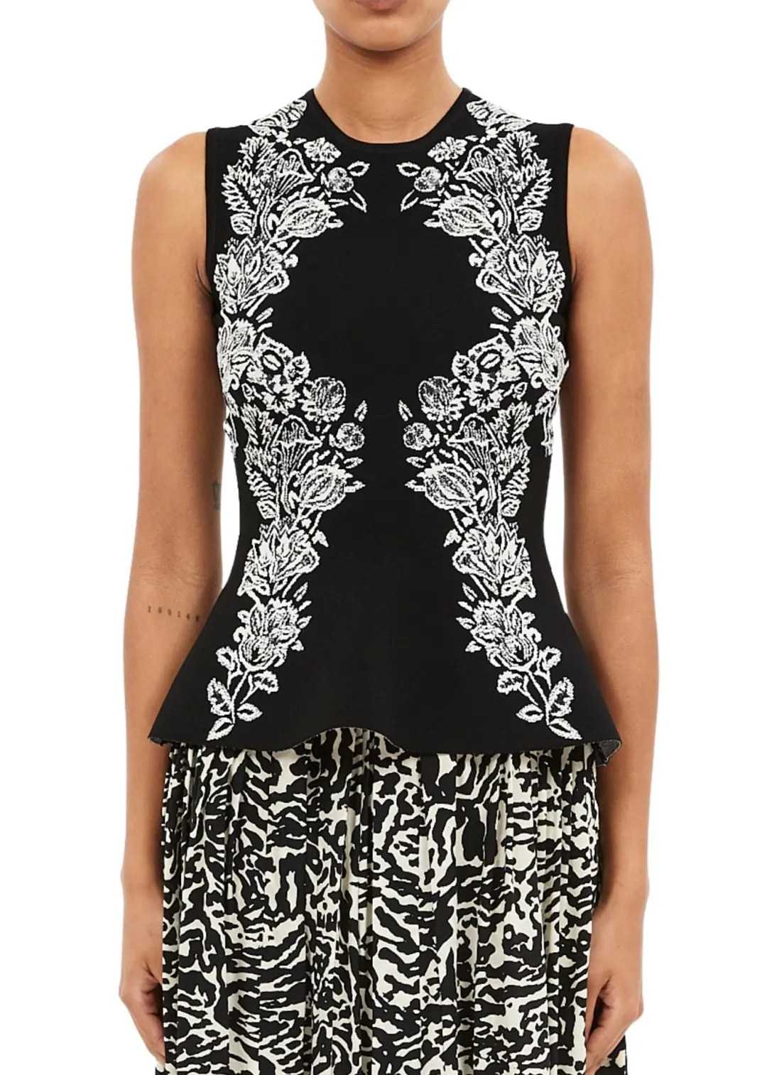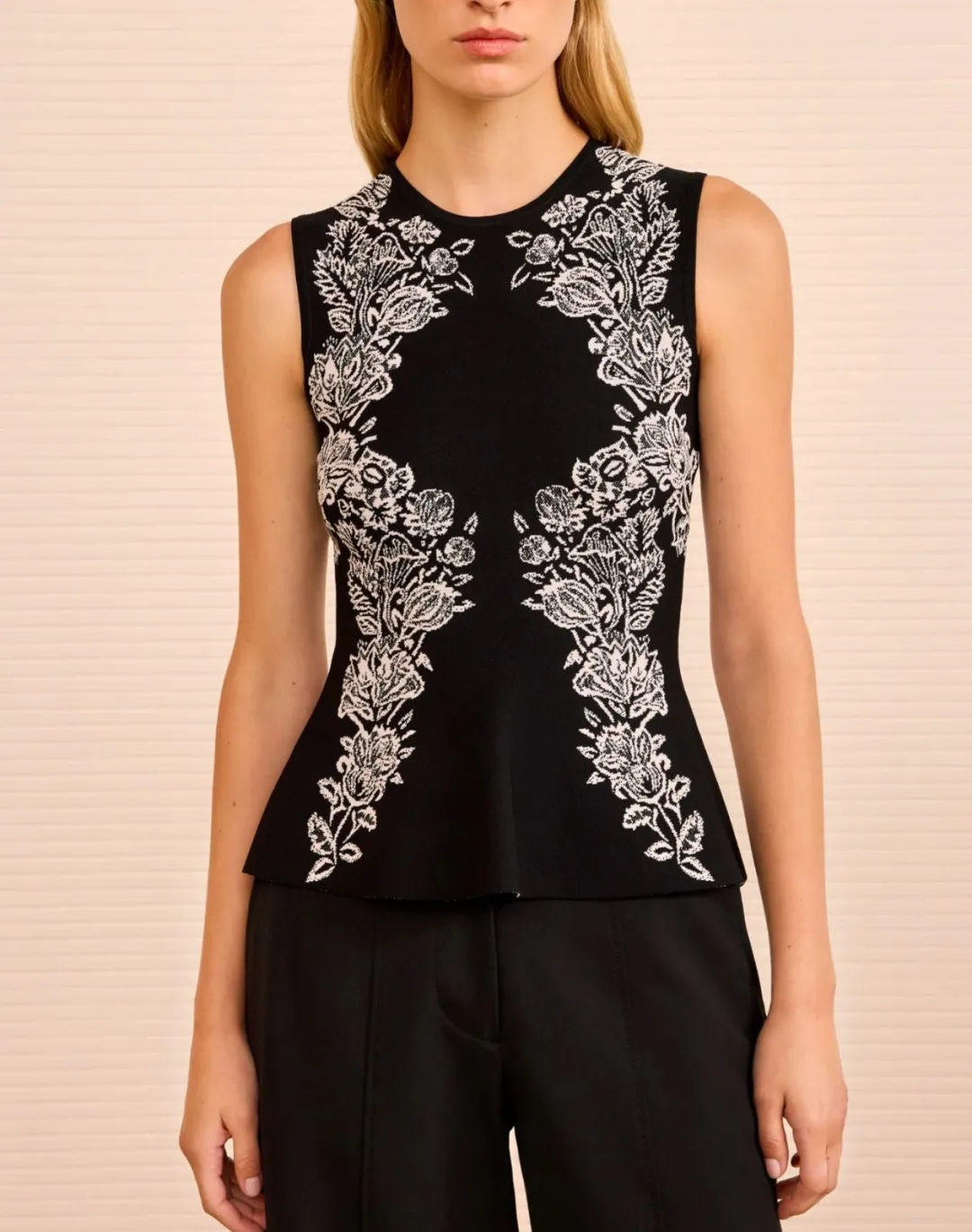 Artfully knitted from stretch jacquard, the Vanna Tank features vine motifs richly spun in graphic symmetry. This white and black top is softly structured with a peplum hem for timeless refinement.