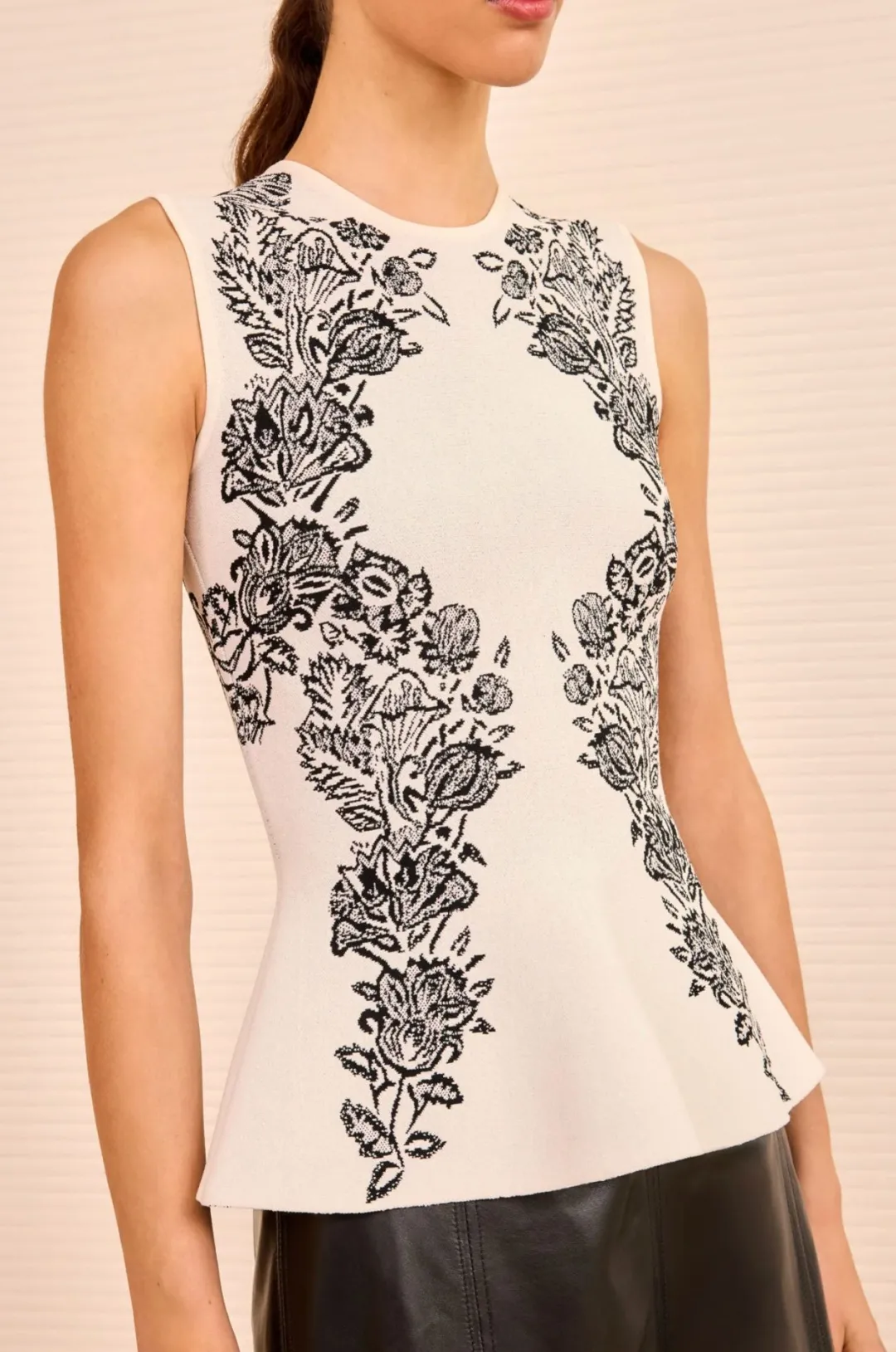 Artfully knitted from stretch jacquard, the Vanna Tank features vine motifs richly spun in graphic symmetry. This white and black top is softly structured with a peplum hem for timeless refinement.