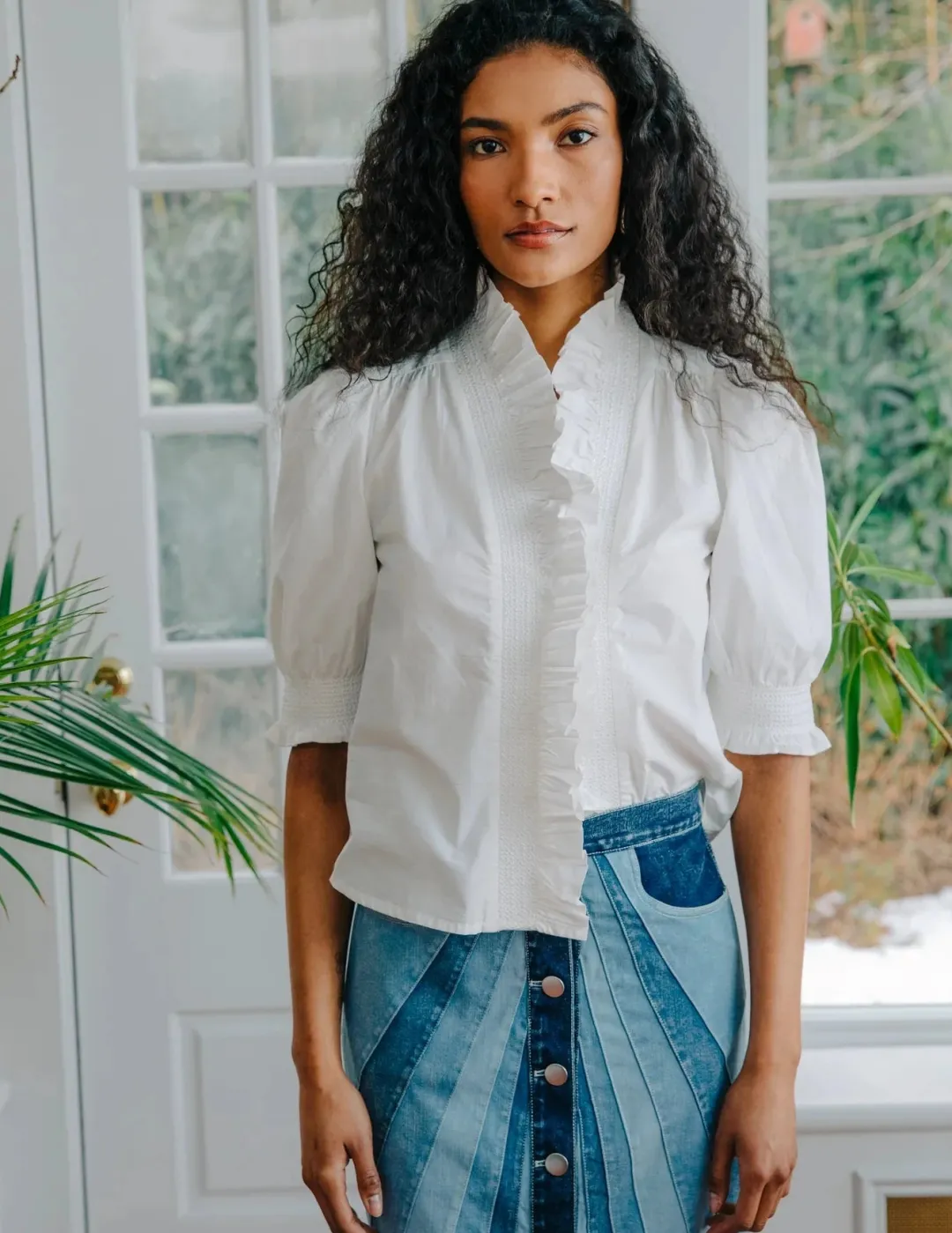 Loved for its ruffled neckline and center front smocked placket, it features a functional placket with signature shell buttons and decorative smocking at the puff sleeves.